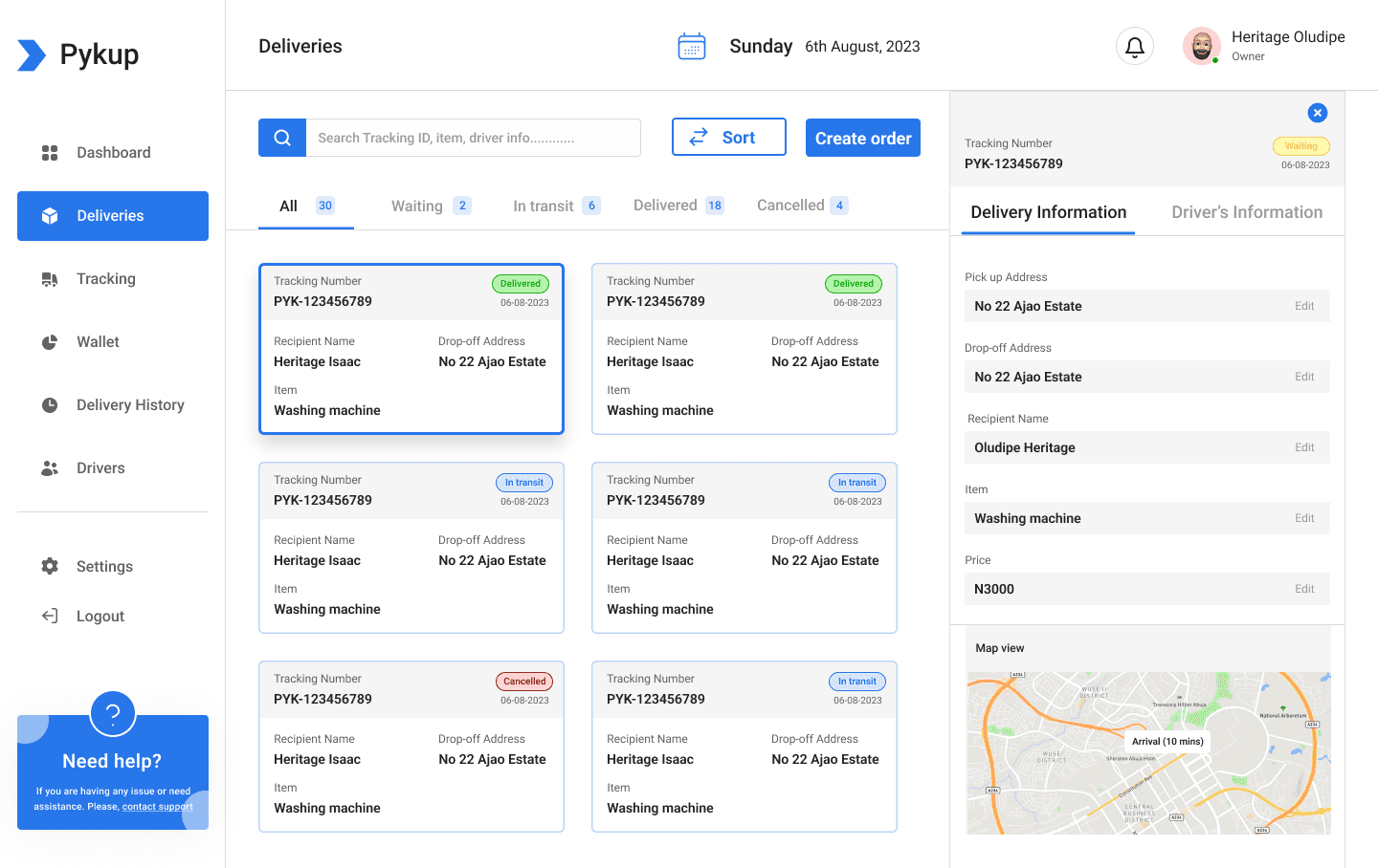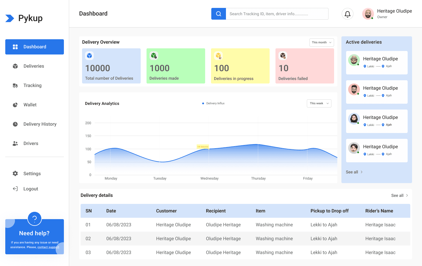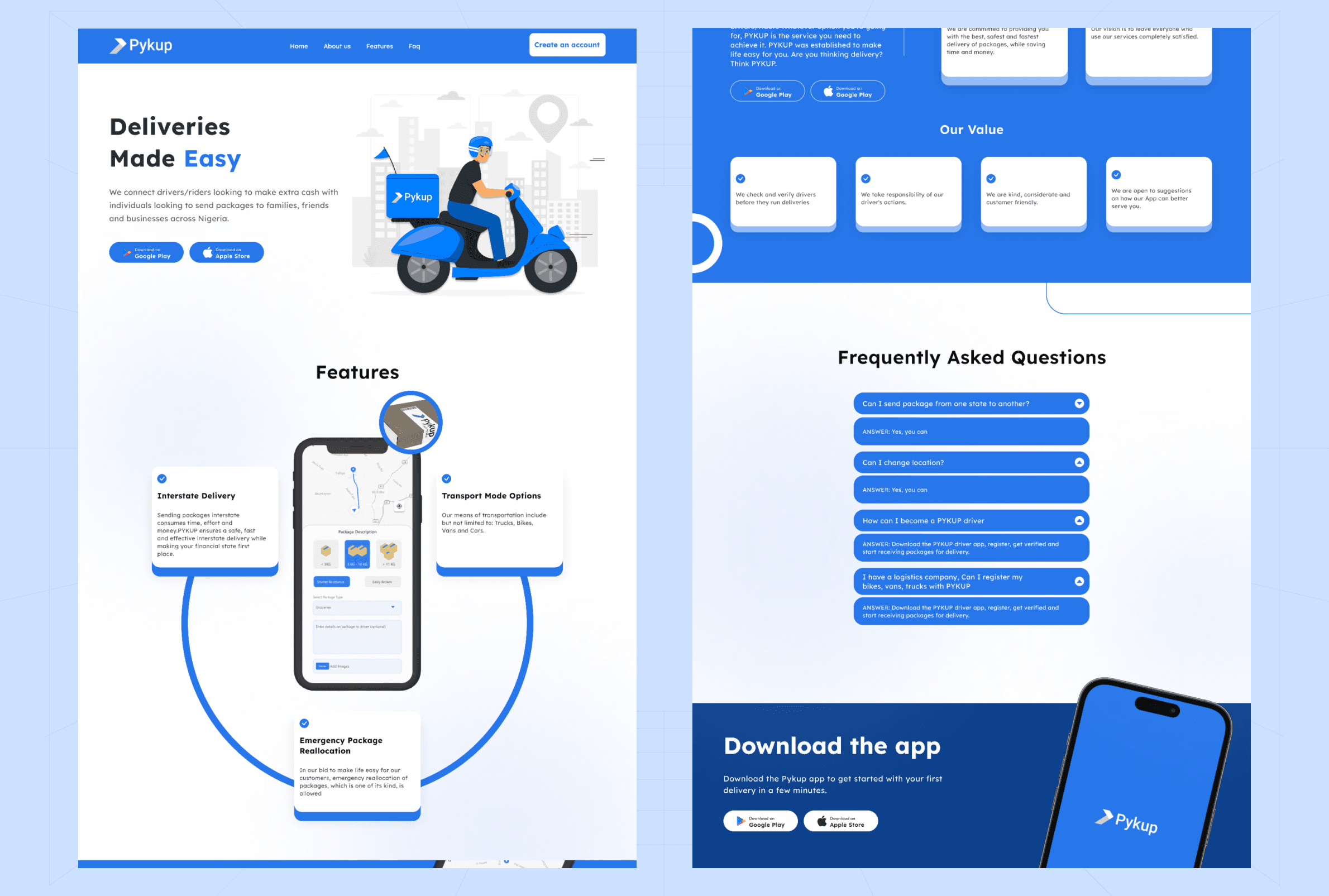 Pykup is a logistics platform that connects delivery drivers with customers needing to send packages. The project included designing the landing page, business dashboard, and admin dashboard.